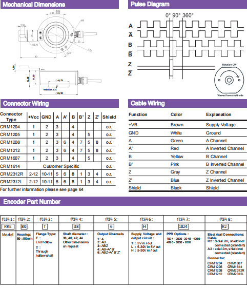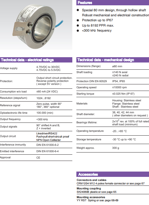 ○ | 空載電流:≤ 60mA(24 VDC) | ○ | 分辨率(脈沖數/轉): 1024…8192 | |||